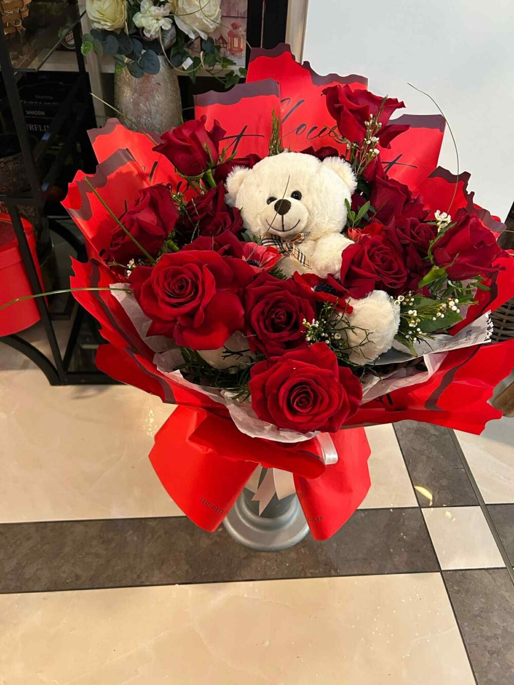 BUCHET 17 TRANDAFIRI ROSII SI URSULET
