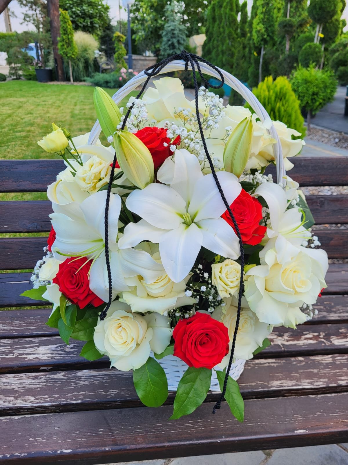 Cos funerar cu crin ,trandafiri ,gipsofila .